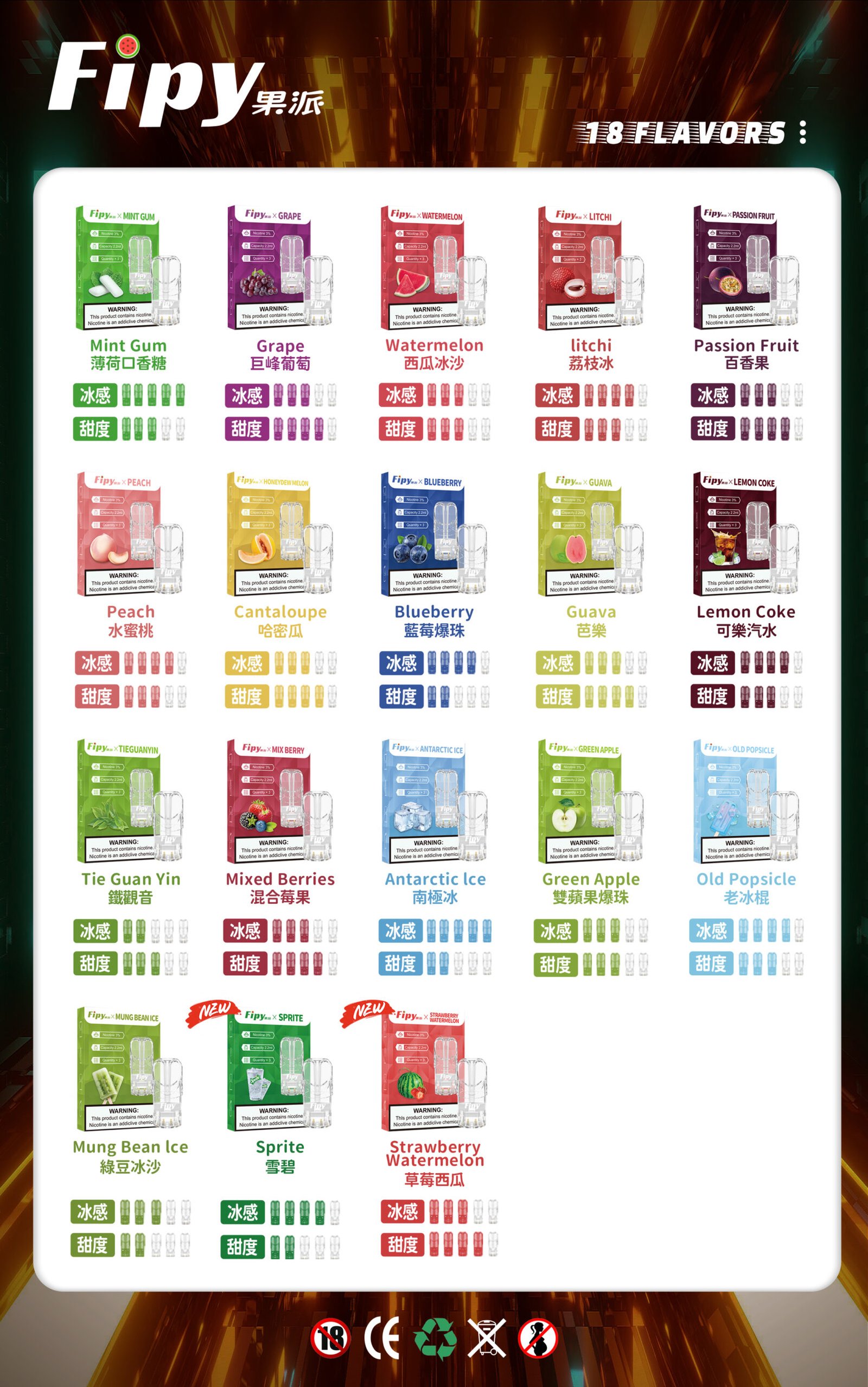 FIPY 果派煙彈專為一代霧化主機設計,提供 18 種口味選擇,每一款都經過反覆調試,確保層次豐富且順口,無論你是偏好清爽冰感還是香甜果香,都能找到屬於自己的專屬味覺體驗。果派煙彈兼容性強,完美支援 Fipy、SP2S、LANA、RELX、ILIA 等熱門一代主機,讓每位電子煙愛好者都能找到自己喜愛的風味。